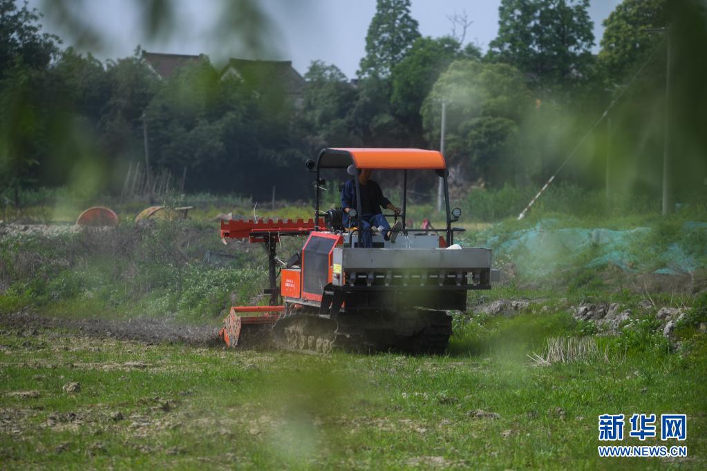 在東林鎮(zhèn)保永村,種植戶操作旋耕機耕地,準(zhǔn)備播種水稻(5月7日攝)。