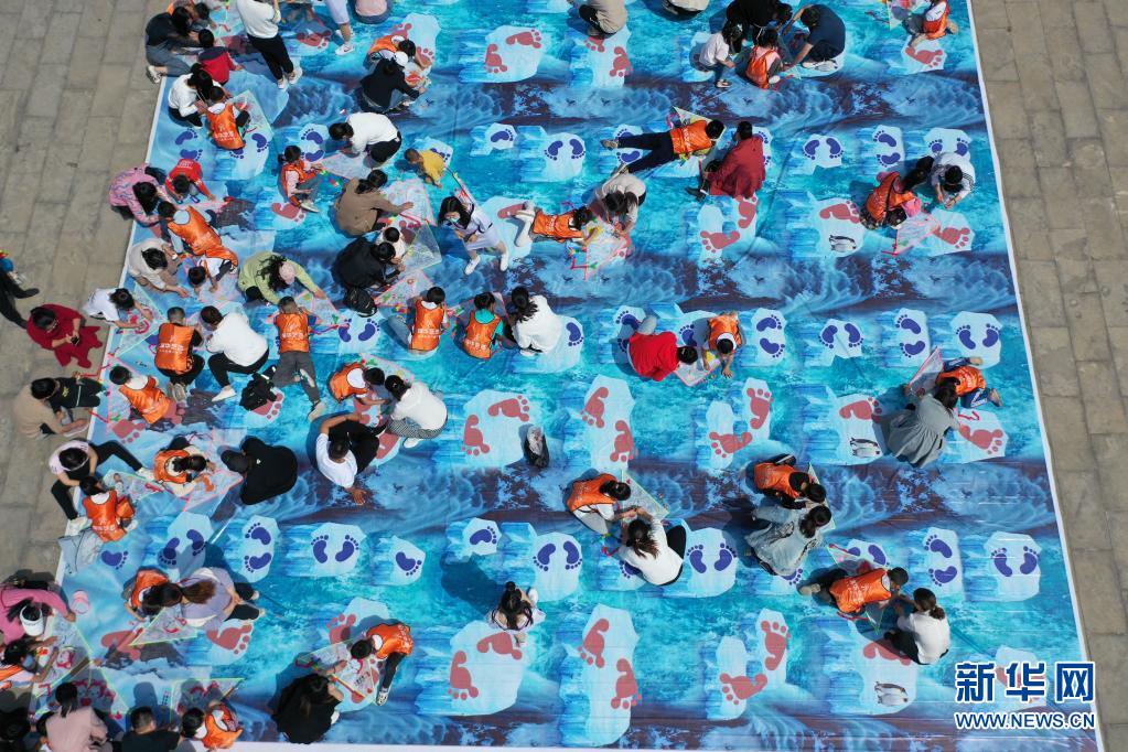5月9日,在河北省新河縣南湖公園,孩子們跟媽媽一起繪制風(fēng)箏(無(wú)人機(jī)照片)。