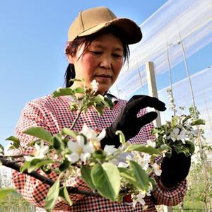 5月9日,在甘肅省平?jīng)鍪徐o寧縣城川鎮(zhèn)一蘋果有機示范園里,果農(nóng)在疏花。