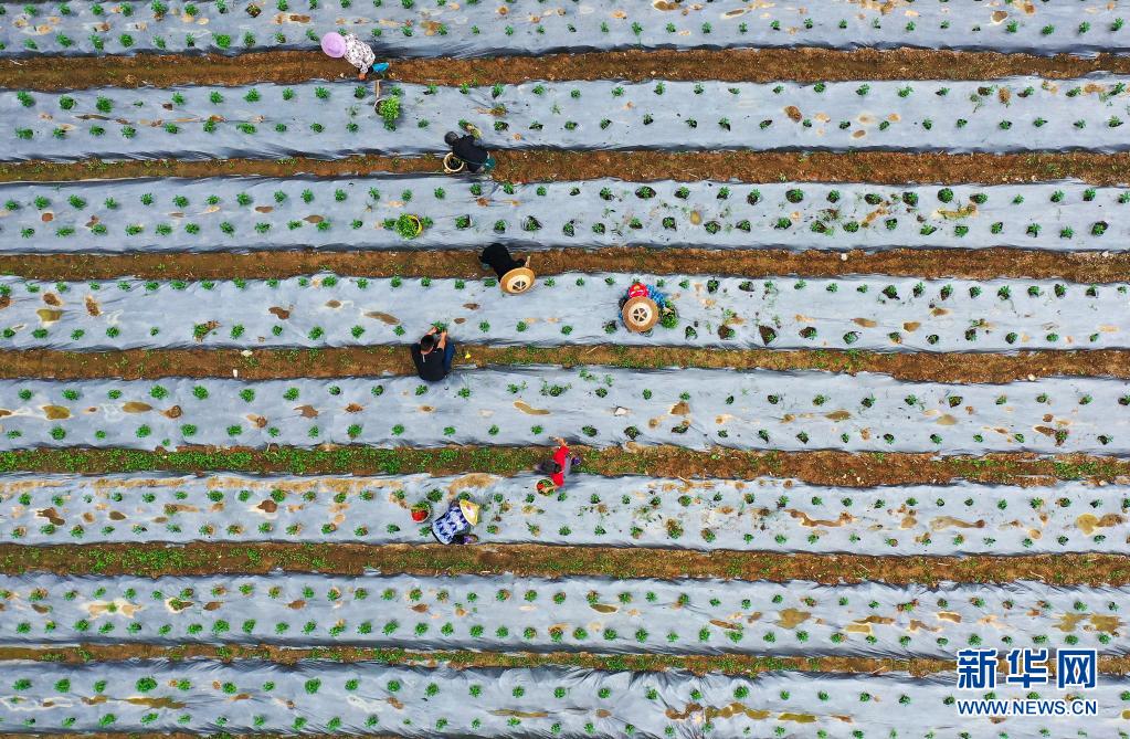5月13日,村民在玉屏侗族自治縣田坪鎮(zhèn)慶寨村辣椒種植基地勞作(無人機照片)。