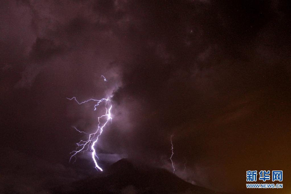 這是5月13日在印度尼西亞北蘇門答臘省拍攝的錫納朋火山上空的閃電(長時(shí)間曝光照片)。