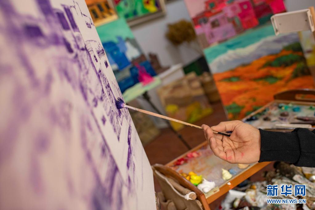 麥麥提吐?tīng)栠d江·麥麥提依明在位于新疆喀什古城景區(qū)的工作室內(nèi)進(jìn)行創(chuàng)作(5月5日攝)。新華社記者 胡虎虎 攝