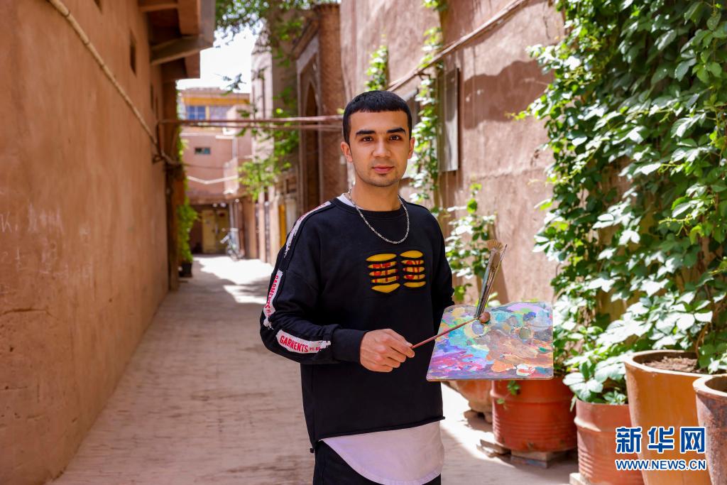 這是在新疆喀什古城景區(qū)的小巷內(nèi)拍攝的青年畫家麥麥提吐爾遜江·麥麥提依明(5月8日攝)。新華社記者 胡虎虎 攝