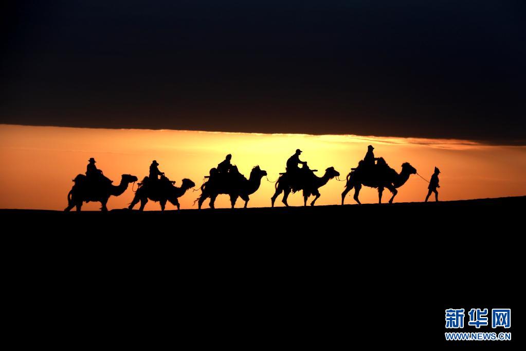 5月15日,游客騎駱駝在甘肅省敦煌市鳴沙山月牙泉景區(qū)游覽。晨光下,云彩、沙山、駝隊(duì)構(gòu)成了一幅美麗迷人的畫卷。新華社發(fā)(張曉亮 攝)
