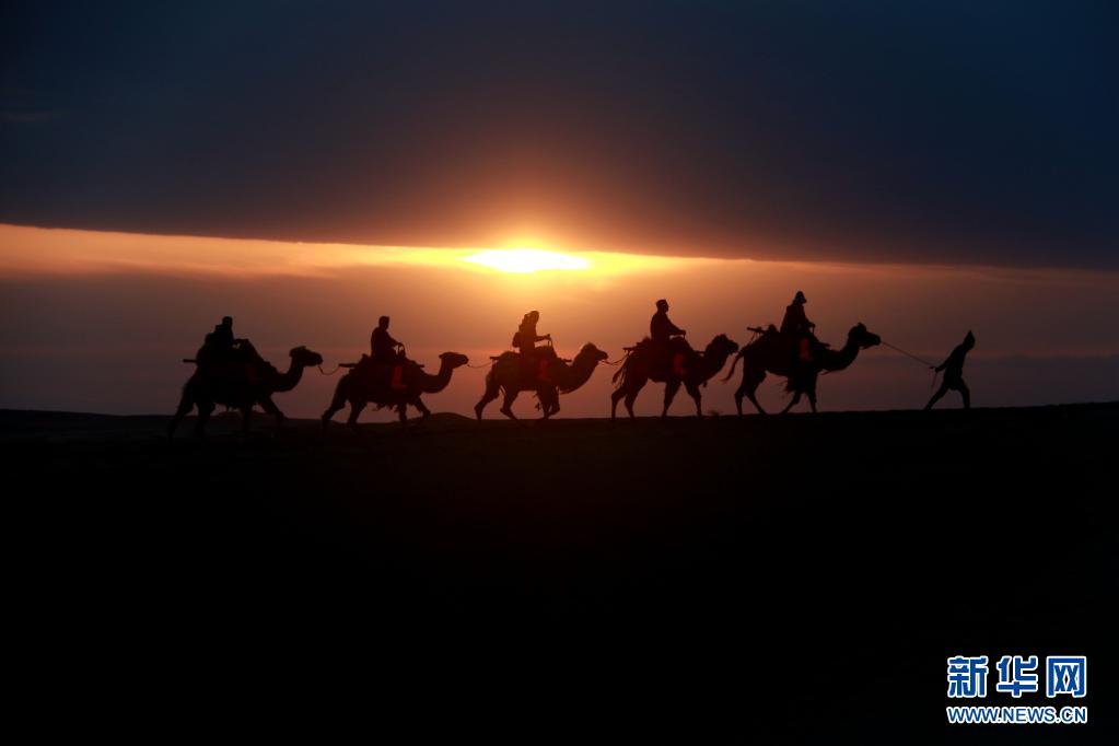 5月15日,游客騎駱駝在甘肅省敦煌市鳴沙山月牙泉景區(qū)游覽。晨光下,云彩、沙山、駝隊構(gòu)成了一幅美麗迷人的畫卷。新華社發(fā)(張曉亮 攝)