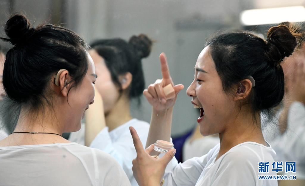 天津理工大學(xué)聾人工學(xué)院的舞蹈隊(duì)員們?cè)趯W(xué)校的劇場里化妝時(shí)交流(5月10日攝)。新華社記者 趙子碩 攝