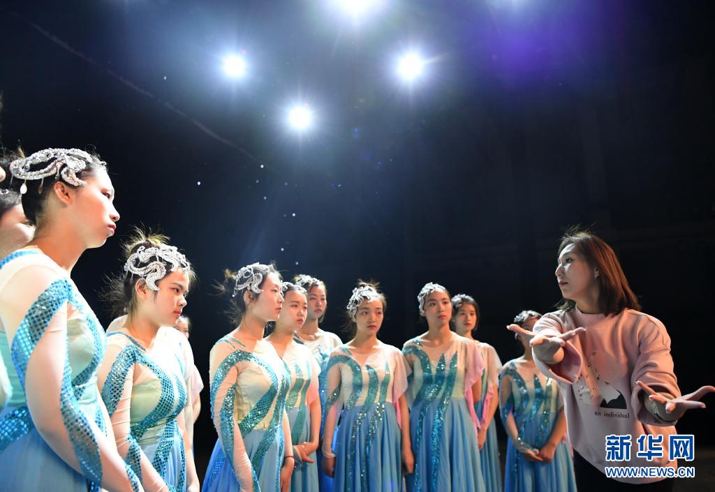 天津理工大學(xué)聾人工學(xué)院的舞蹈隊(duì)員們?cè)趯W(xué)校的劇場(chǎng)里和指導(dǎo)老師交流(5月10日攝)。新華社記者 李然 攝