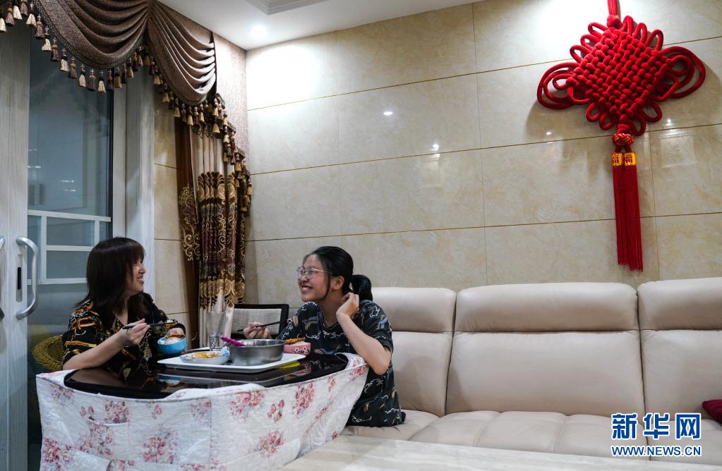 2021年5月10日,蔣張子怡(右)和母親在家中吃飯。