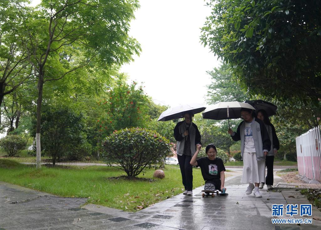 16歲的蔣張子怡是江西上饒中學(xué)高中一年級的學(xué)生。2010年一場車禍奪去了她的雙腿,如今的她只能依靠滑板代步,用雙手前行,為此,大伙都稱她“滑板姑娘”。