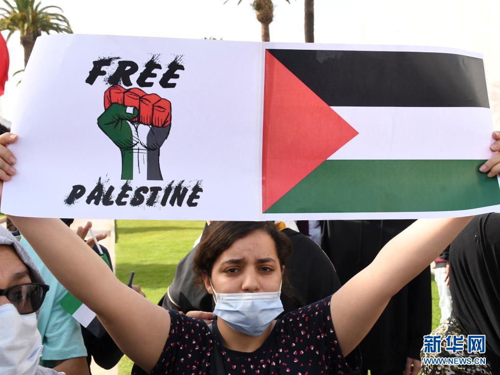 5月15日,一名女子在摩洛哥首都拉巴特參加抗議示威活動(dòng),聲援巴勒斯坦民眾。