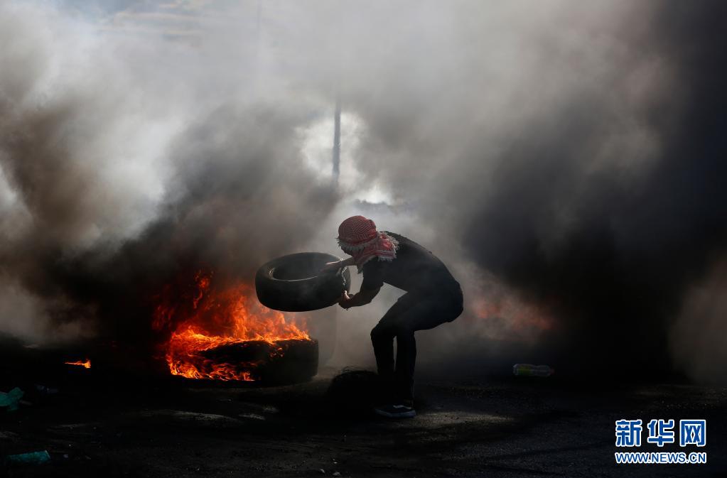 5月18日,一名巴勒斯坦示威者在約旦河西岸城市納布盧斯附近的沖突中焚燒輪胎。