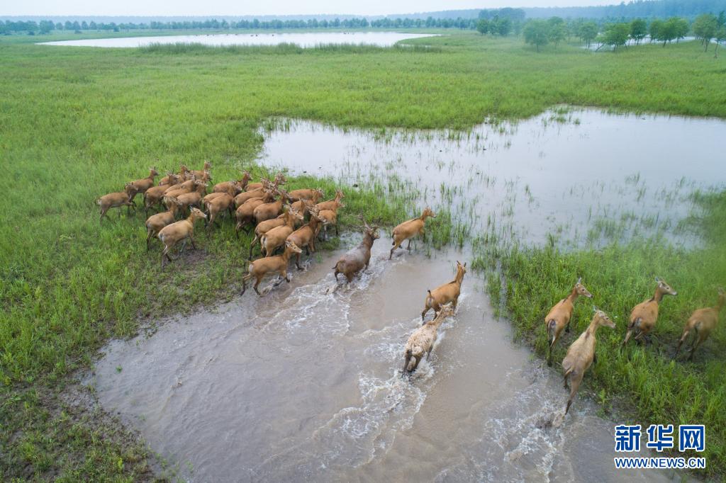 5月17日,一群麋鹿在石首麋鹿國家級自然保護區(qū)內活動(無人機照片)。新華社記者 肖藝九 攝