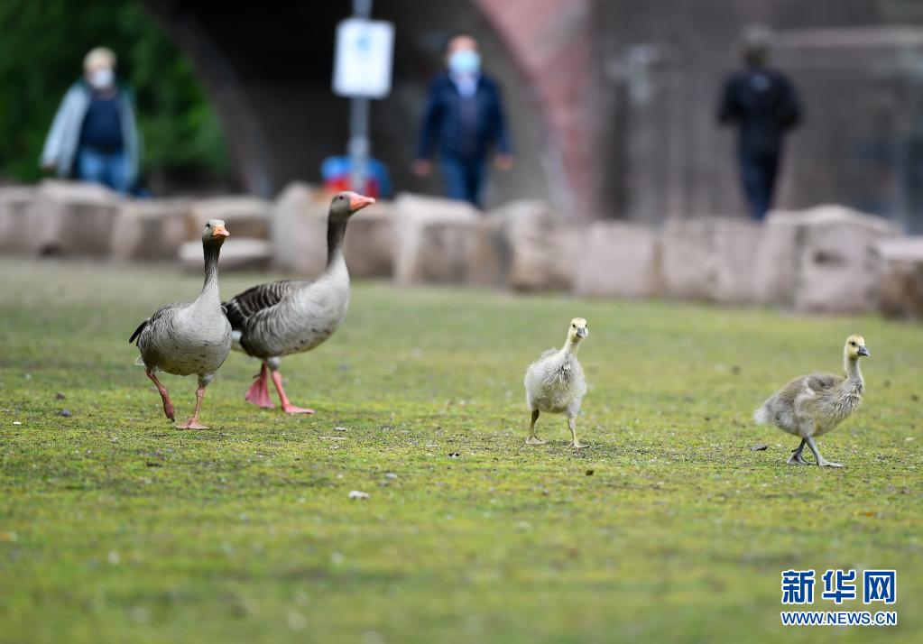 5月19日,幾只灰雁在德國(guó)法蘭克福的美茵河畔覓食。
