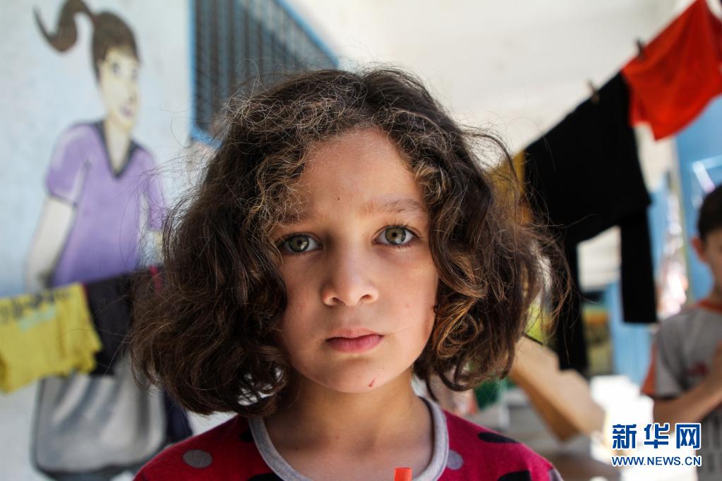 5月19日,受空襲影響而逃離家園的5歲巴勒斯坦兒童薩馬·蘇丹在加沙城的一所學校臨時棲身。
