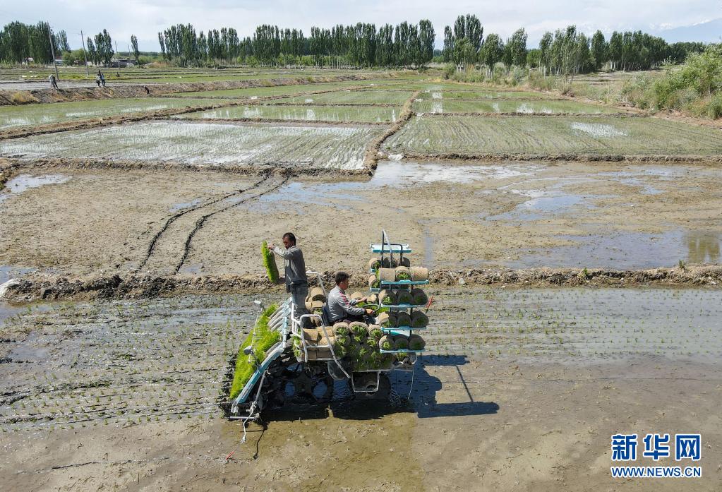 進入5月,新疆溫宿縣的11萬余畝水稻進入插秧期。稻田間,插秧機往來穿梭,一片繁忙景象。