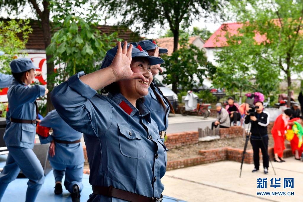5月21日,在棗莊市臺(tái)兒莊區(qū)馬蘭屯鎮(zhèn)西張莊村,“學(xué)黨史惠民”文藝小分隊(duì)為群眾表演節(jié)目。