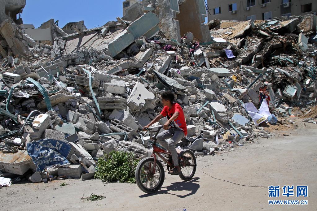 5月23日,一個(gè)男孩在加沙城騎車經(jīng)過遭以軍空襲損毀的賈拉塔。5月10日以來,以色列與加沙地帶武裝組織之間爆發(fā)嚴(yán)重沖突。20日晚,哈馬斯與以色列方面各自宣布,雙方已達(dá)成停火協(xié)議,?;饛?1日凌晨開始。新華社發(fā)(里澤克·阿卜杜勒·賈瓦德攝)