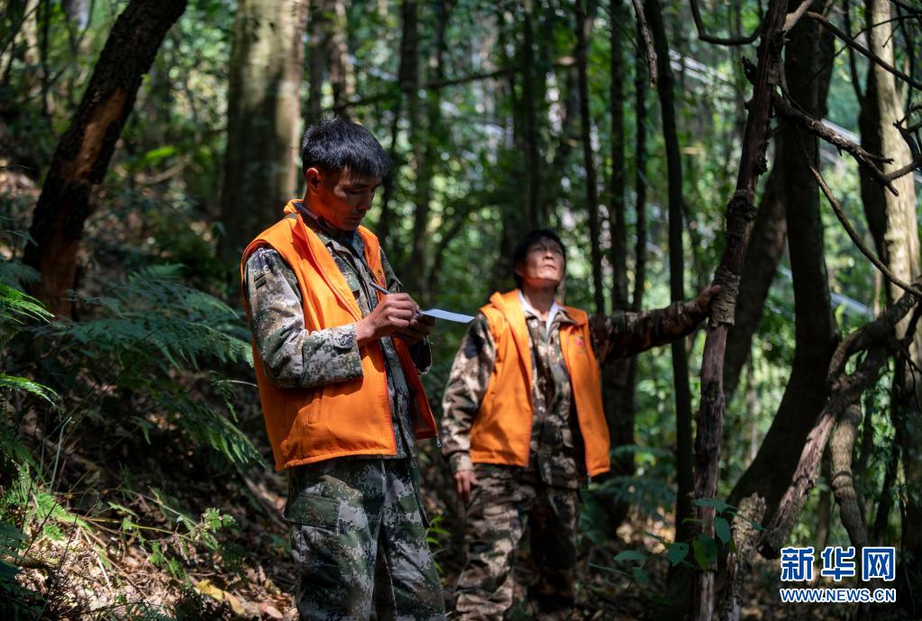 護林員楊有山(左)在林間記錄天行長臂猿家庭的活動情況(3月15日攝)。