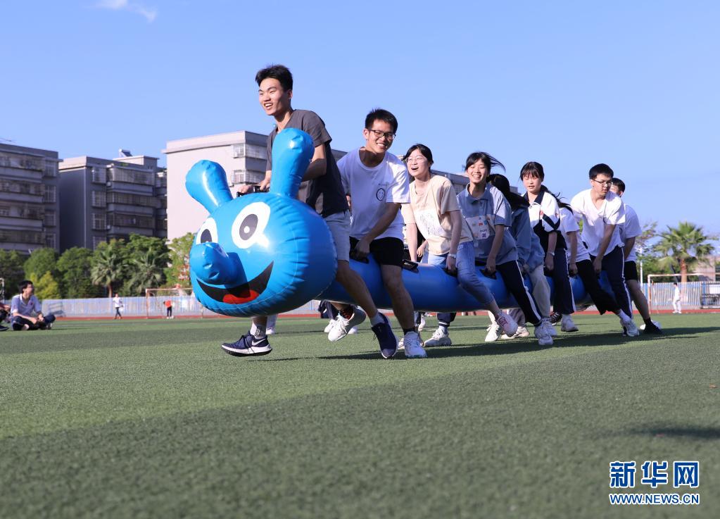 5月25日,湖南省永州市道縣第一中學(xué)的高三學(xué)生在做“同舟共濟(jì)”游戲。
