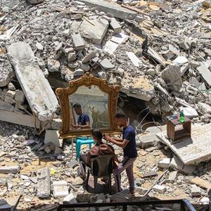 5月26日,在加沙地帶北部的城鎮(zhèn)貝特拉希亞,23歲的巴勒斯坦理發(fā)師阿卜杜拉·扎瓦拉在他被以色列炸毀的房屋前為顧客免費(fèi)服務(wù)?!⌒氯A社發(fā)(里澤克·阿卜杜勒·賈瓦德攝)
