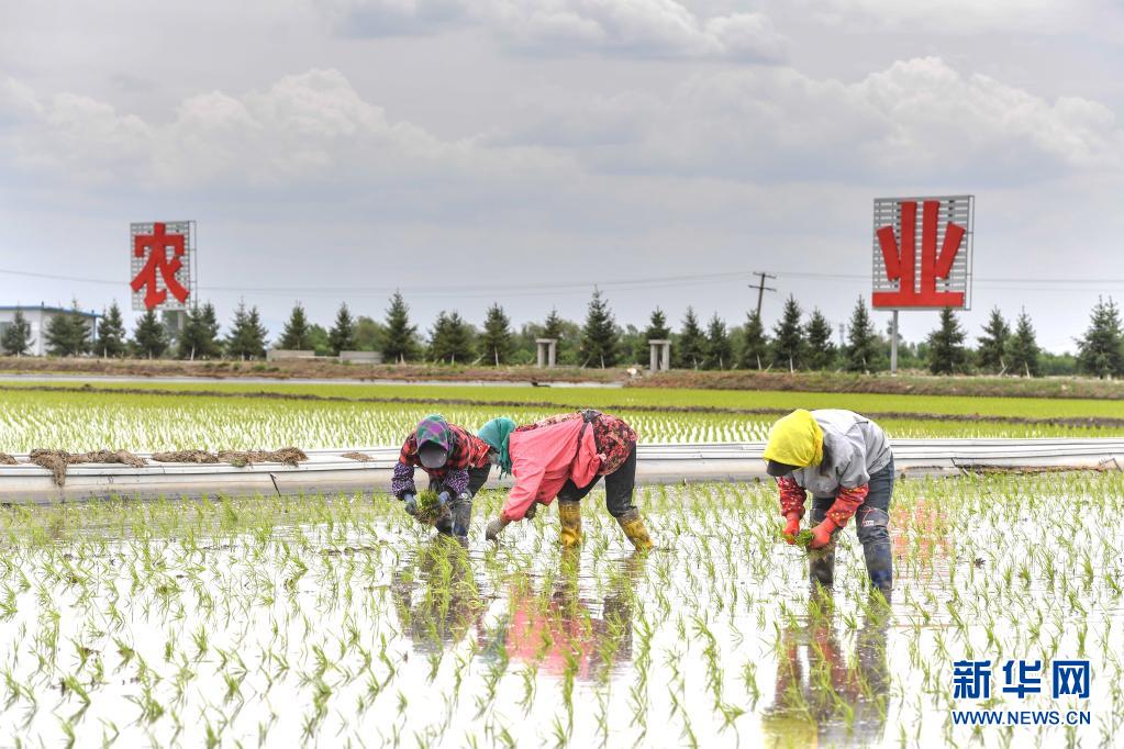 5月26日,在吉林省吉林市永吉縣萬昌鎮(zhèn)宇豐米業(yè)2萬畝高標準水田基地,農民進行水稻補苗工作。