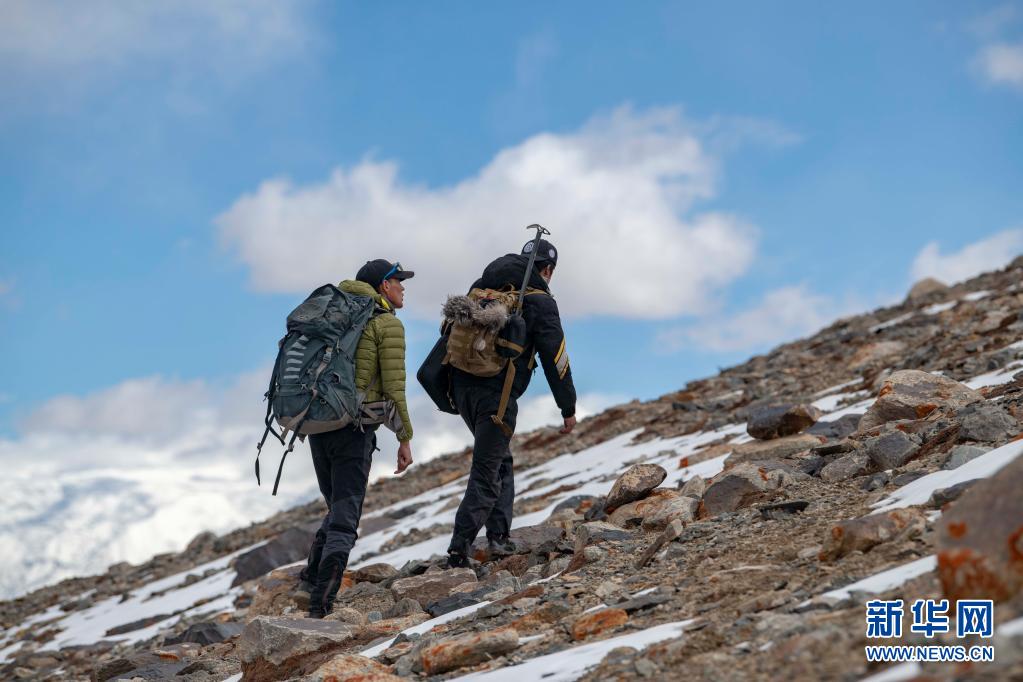 別克米爾扎·圖爾達力(右)和同伴庫爾班巴依·努爾麥麥提在進行適應性練習(5月15日攝)。新華社記者 胡虎虎 攝