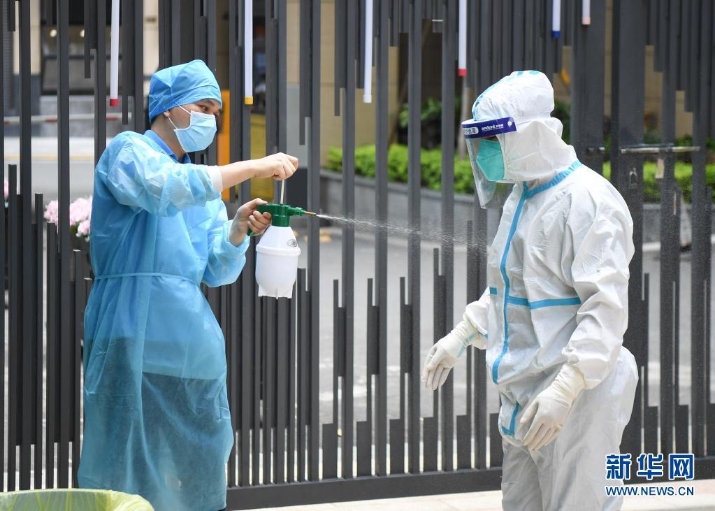 5月27日,在廣州荔灣區(qū)白鶴洞街道一小區(qū)檢測(cè)點(diǎn),荔灣區(qū)骨傷科醫(yī)院的醫(yī)護(hù)人員給換班下來的同事噴灑消毒液。新華社記者 鄧華 攝