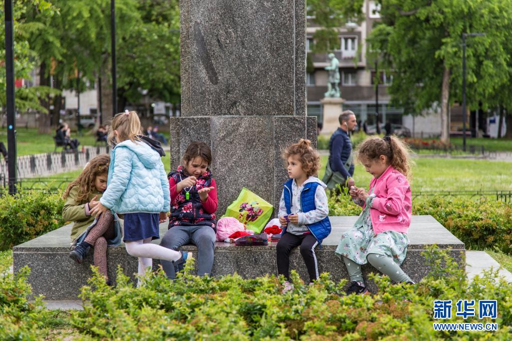 5月31日,孩子們?cè)谌麪柧S亞貝爾格萊德的公園里玩耍。