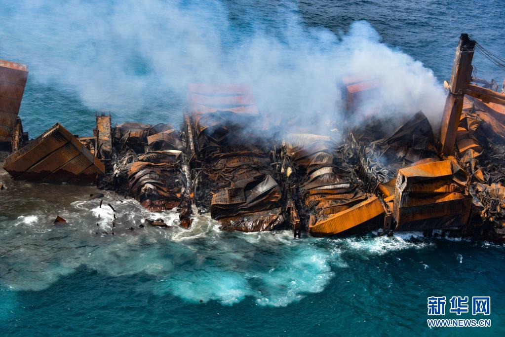 這是6月2日在斯里蘭卡科倫坡港附近拍攝的逐漸下沉的起火貨船“X-PRESS PEARL”號。