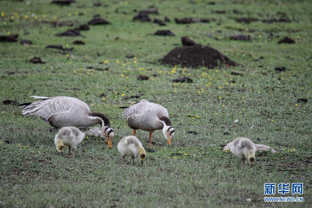這是6月2日在甘肅省甘南藏族自治州碌曲縣尕海湖拍攝的斑頭雁及其幼鳥。