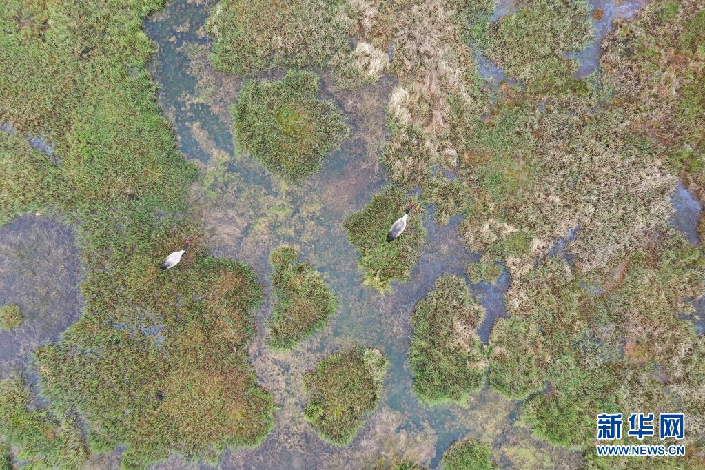 這是6月2日在甘肅省甘南藏族自治州碌曲縣尕海湖拍攝的國(guó)家一級(jí)保護(hù)動(dòng)物黑頸鶴(無(wú)人機(jī)照片)。