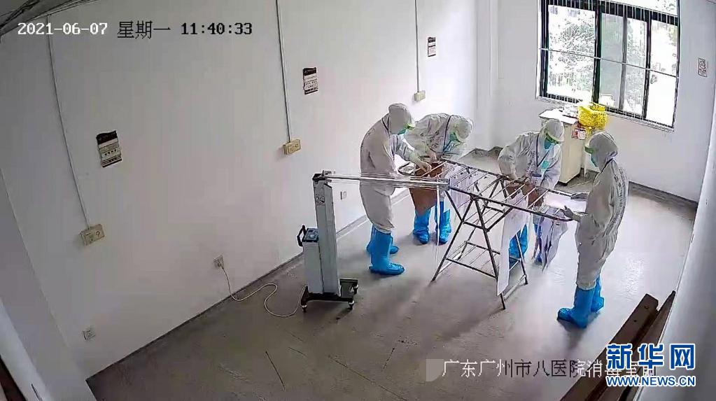 6月7日,廣州市八醫(yī)院嘉禾院區(qū)監(jiān)控畫面顯示,醫(yī)護(hù)人員對隔離病房考生的試卷、答題卡進(jìn)行二次消毒。新華社發(fā)