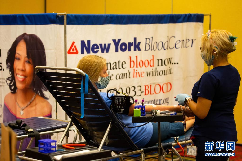 6月14日,在美國紐約州長島地區(qū)的尤寧代爾,獻血志愿者在美國紐約血液中心舉行的獻血活動上獻血。
