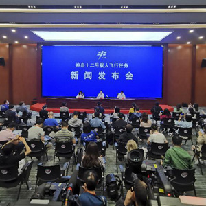 6月16日,神舟十二號載人飛行任務(wù)新聞發(fā)布會在酒泉衛(wèi)星發(fā)射中心召開(手機拍攝)。