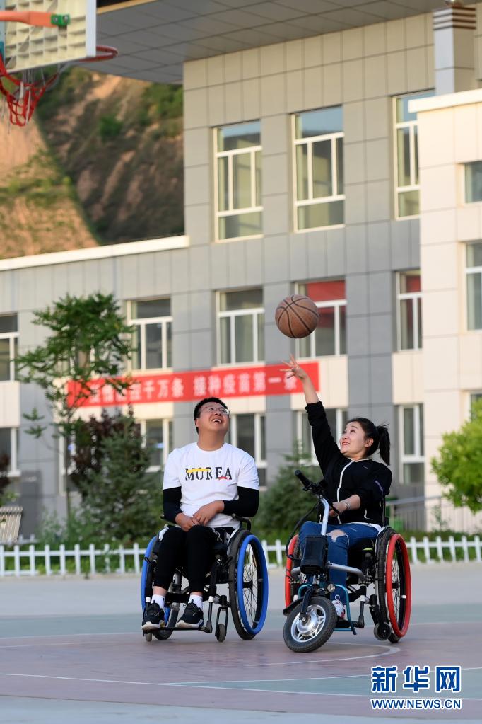 在山西省呂梁市石樓縣體育中心,周海云(左)和關美坐著輪椅打籃球(6月1日攝)。新華社發(fā)(劉亮亮攝)