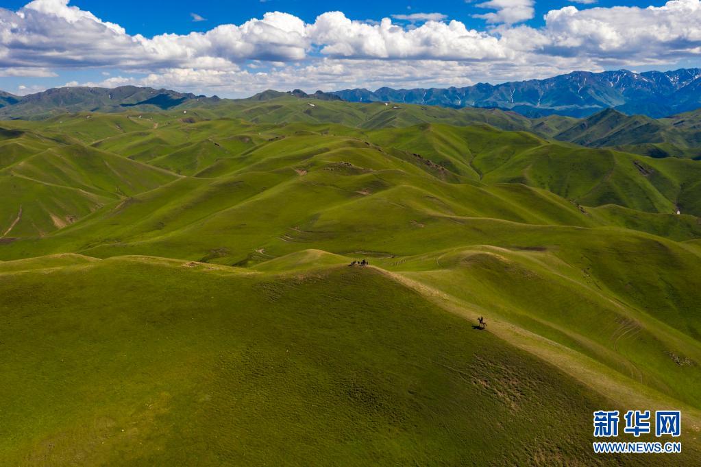 新疆裕民縣的牧民策馬奔馳在巴爾魯克山區(qū)夏牧場上(6月15日攝,無人機照片)。