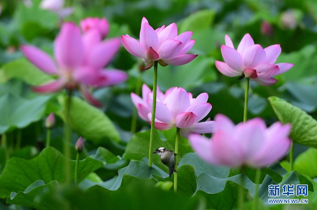 6月21日,在江蘇無錫金匱公園,一只鳥在荷梗上小憩。