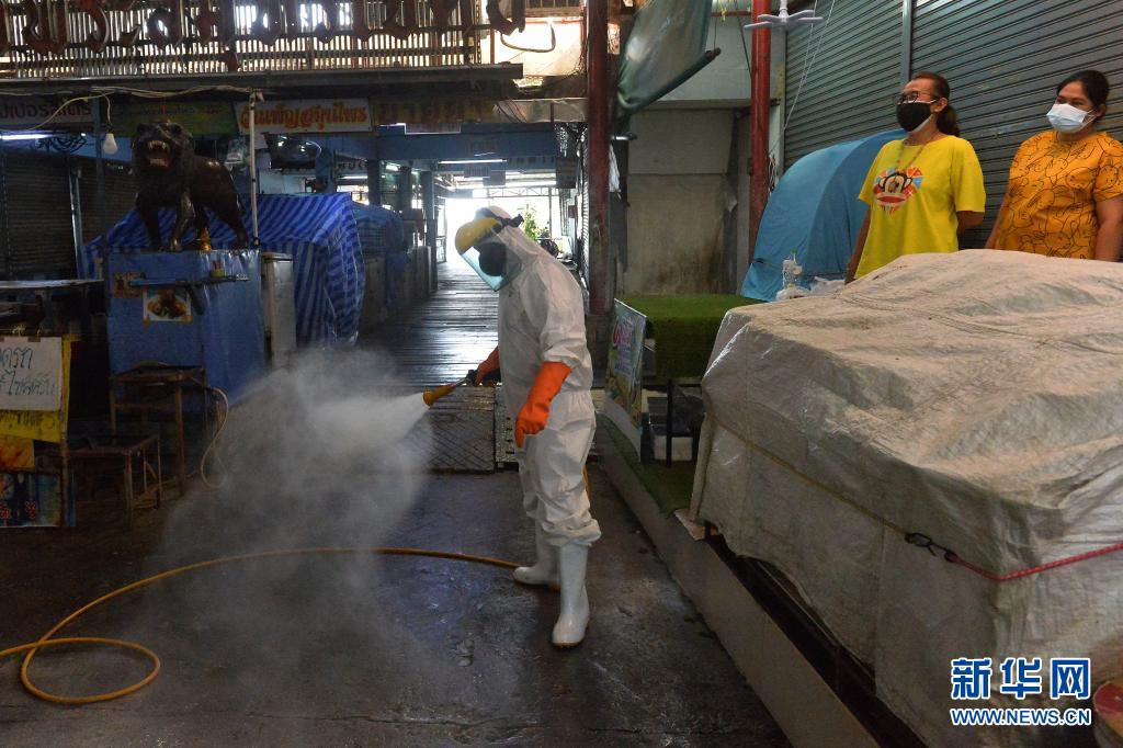 6月21日,工作人員在泰國(guó)首都曼谷一處生鮮市場(chǎng)進(jìn)行消毒。