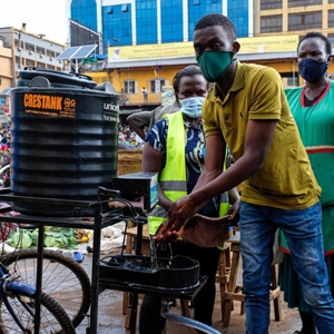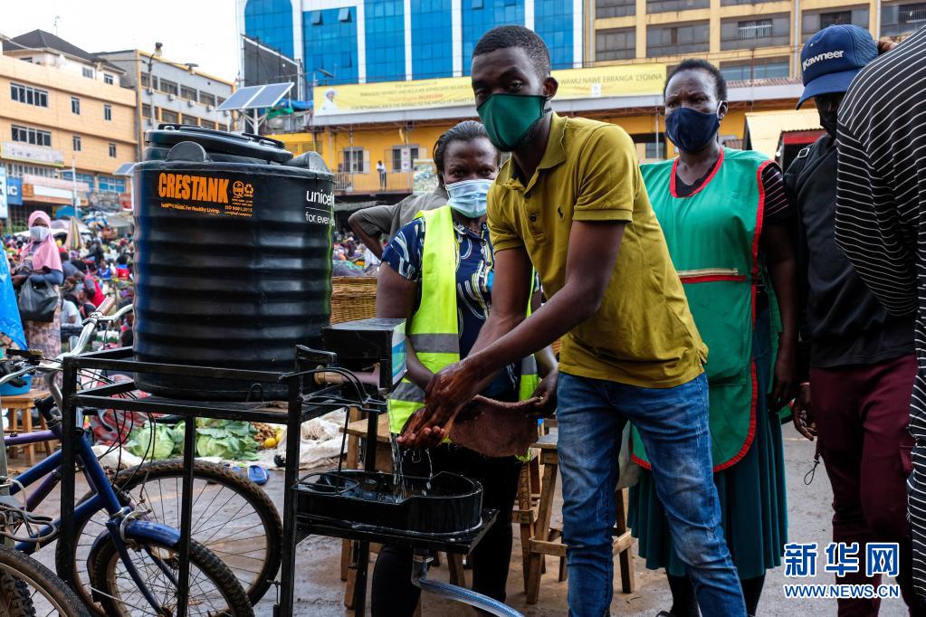 6月23日,一名男子在進(jìn)入烏干達(dá)坎帕拉的納卡塞羅市場(chǎng)前洗手。
