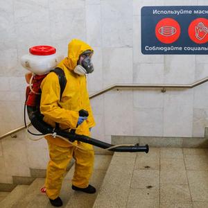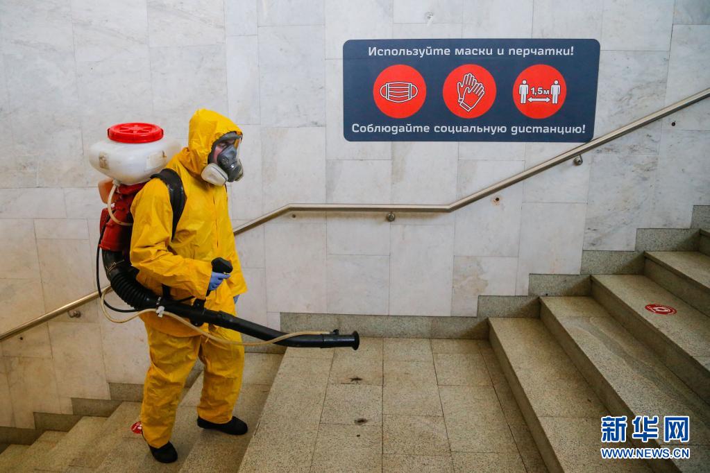 6月24日,工作人員身著防護服在俄羅斯莫斯科一個火車站進(jìn)行消毒作業(yè)。