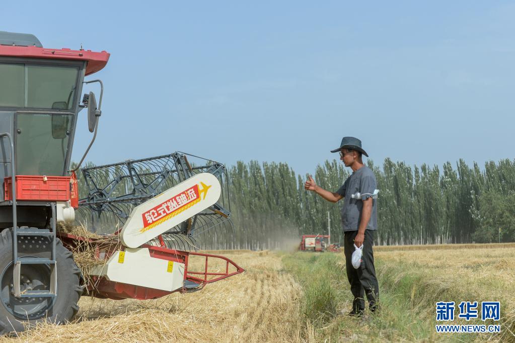 6月19日,麥客阿地力·沙拉木指揮聯(lián)合收割機(jī)進(jìn)行作業(yè)。新華社記者 高晗 攝