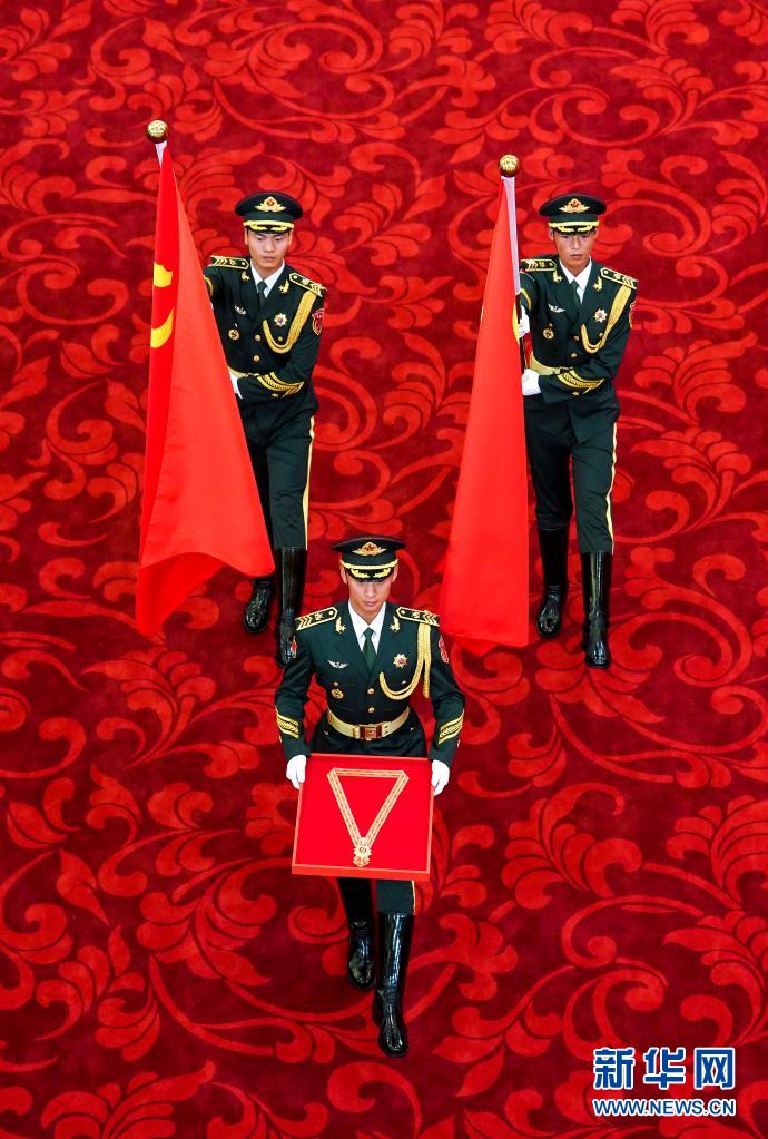 6月29日,慶祝中國(guó)共產(chǎn)黨成立100周年“七一勛章”頒授儀式在北京人民大會(huì)堂金色大廳隆重舉行。這是2名旗手高擎黨旗,1名禮兵手捧“七一勛章”,行進(jìn)到儀式現(xiàn)場(chǎng)。新華社記者 高潔 攝