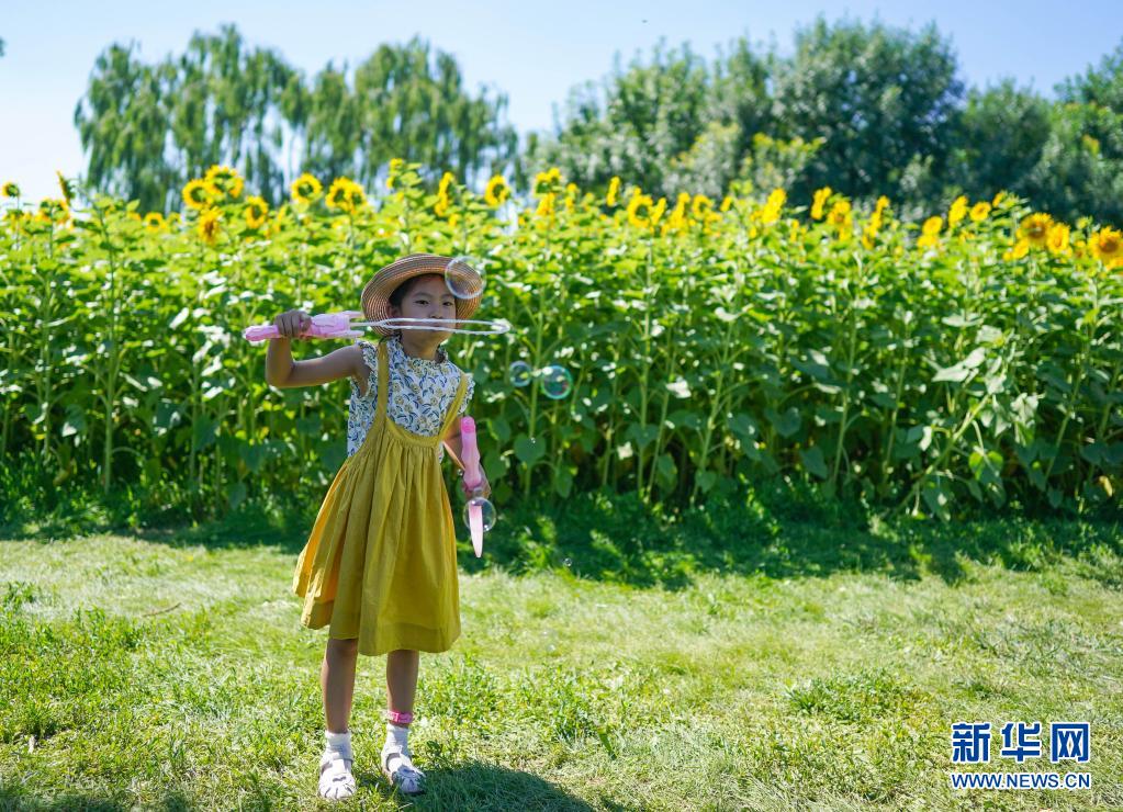 7月4日,小朋友在北京奧林匹克森林公園北園的向日葵花田旁吹泡泡。