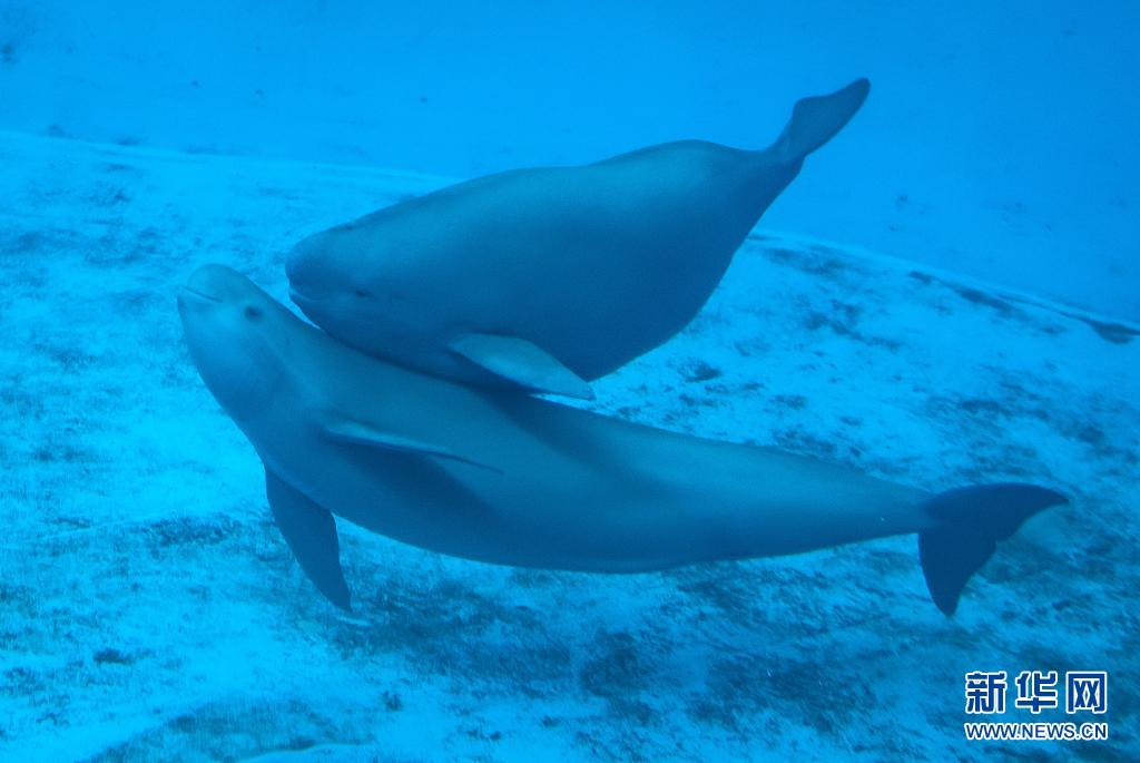 7月5日,江豚媽媽洋洋和小江豚YYC在水中游動。新華社記者肖藝九攝