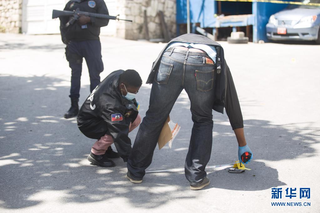 7月7日,在海地太子港,工作人員在海地總統(tǒng)莫伊茲的住所旁開展調查。