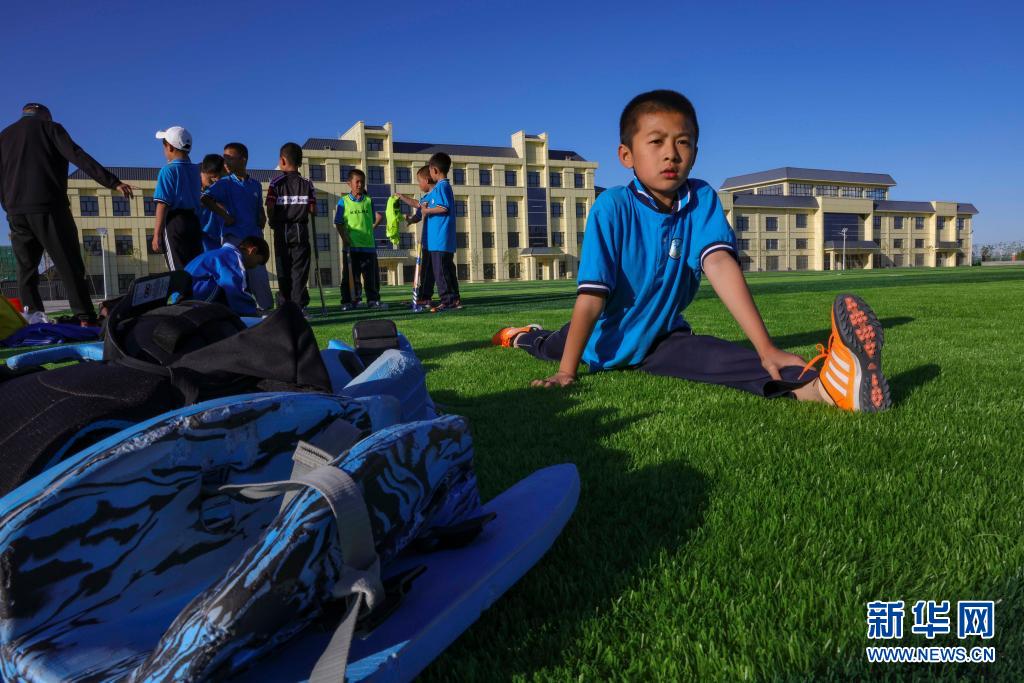 塔城市第二小學(xué)曲棍球隊的小隊員在訓(xùn)練賽前拉伸身體,準備上場(6月13日攝)。