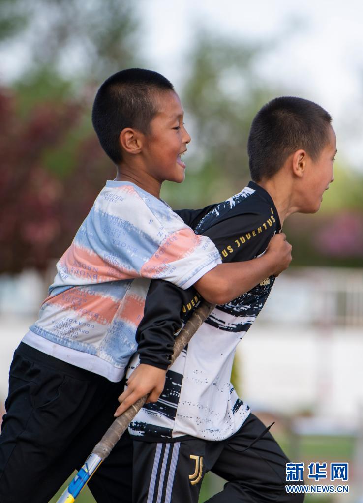 塔城市第二小學(xué)曲棍球隊的小隊員申世豪(左)和隊友哈爾肯·夏里甫歡呼慶祝訓(xùn)練賽中的進(jìn)球(6月11日攝)。