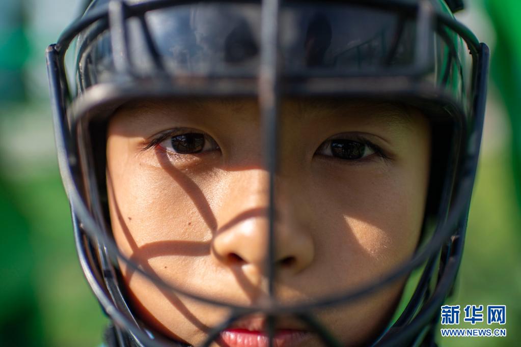 身著護(hù)具的塔城市第二小學(xué)曲棍球隊(duì)員李俊杰在場上擔(dān)任守門員的角色(6月11日攝)。