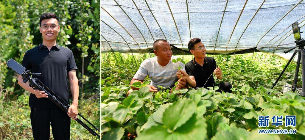 拼版照片:左圖為張成蘊在山西省運城市絳縣臨澮村的田間;右圖為張成蘊(右)在大棚里錄制農業(yè)科普視頻(7月14日攝)。今年34歲的張成蘊大學畢業(yè)后,一直熱衷于用拍攝視頻的方式宣傳家鄉(xiāng)的風土人情。2018年8月,他開始在社交平臺上幫助鄉(xiāng)親們直播帶貨,真誠的笑容、優(yōu)質的產品和專業(yè)的知識是他吸引粉絲的“訣竅”。
