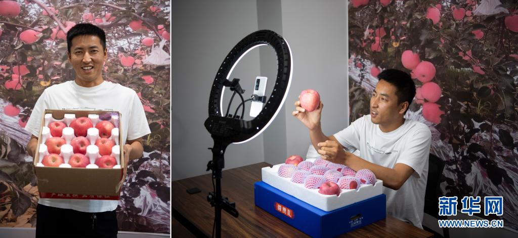 拼版照片:左圖為郭鋒杰展示山西省吉縣產(chǎn)的蘋果;右圖為郭鋒杰通過網(wǎng)絡(luò)直播銷售蘋果(7月9日攝)。今年32歲的郭鋒杰是吉縣古賢村人,常年在外從事建筑行業(yè)。吉縣有“蘋果之鄉(xiāng)”的美譽(yù),看到吉縣蘋果在農(nóng)村電商領(lǐng)域的發(fā)展?jié)摿?,郭鋒杰經(jīng)過長期考察后,選擇返鄉(xiāng)創(chuàng)業(yè)。返鄉(xiāng)后,他忙著和果農(nóng)洽談合作,聯(lián)系各大商超,自己也開起了網(wǎng)店,做起了“主播”。
